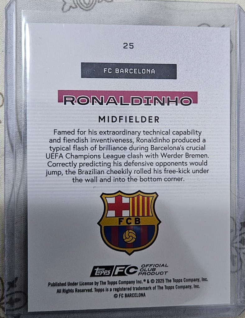 Card rar Ronaldinho Bona Fide, ediție limitată numerotată 038/250. O piesă exclusivă pentru colecționarii pasionați de fotbal și rarități autentice.